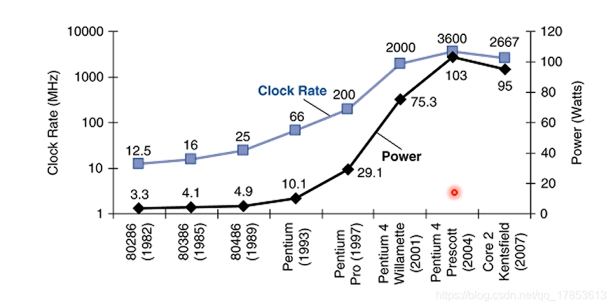 自1982年以来,时钟频率增长了一千倍不知,但功耗仅上升了30倍,这是因为能耗是电压平方的函数,能够通过降低电压来将大幅减少功耗,20多年来,电压从5V降到了1V,所以能耗仅上升了30倍。